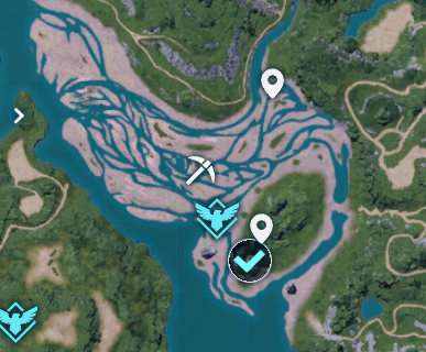 팰의 체액은 초반 온천 제작 때문에 잠깐 쓰고 당분간 잊어버리게 되는데요. 그 이후 시멘트 제작에 필요합니다. 시멘트는 건축물에도 쓰이지만, 상위 펠 스피어 제작에도 들어가기 때문에 무시할 수 없는 재료입니다. 그런데 광석처럼 고정된 위치에 있지 않고 펠을 포획하거나 사냥해야만 얻을 수 있어 다소 까다로운데요. 가장 편하게 얻을 수 있는 장소는 아래 지도에 있는 새끼 상어의 구역 석상 근처입니다. 여기에서는 샤키드라는 아기 상어 형태의 펠이 나오는데요. 한두 마리가 나오는 것이 아니고 이 근처에서 두세 마리씩 열 무리 이상이 돌아다니기 때문에, 근방을 돌면서 샤키드를 정리해 주면 많은 양의 체액을 쉽게 얻을 수 있습니다. 다만 이 지역에서 등장하는 샤키드의 레벨이 20대 초반인 점 감안하시기 바랍니다. 혹시 레벨이 모자라신 경우에는 다른 물 속성 팰들을 잡으셔도 체액을 얻을 수 있습니다.