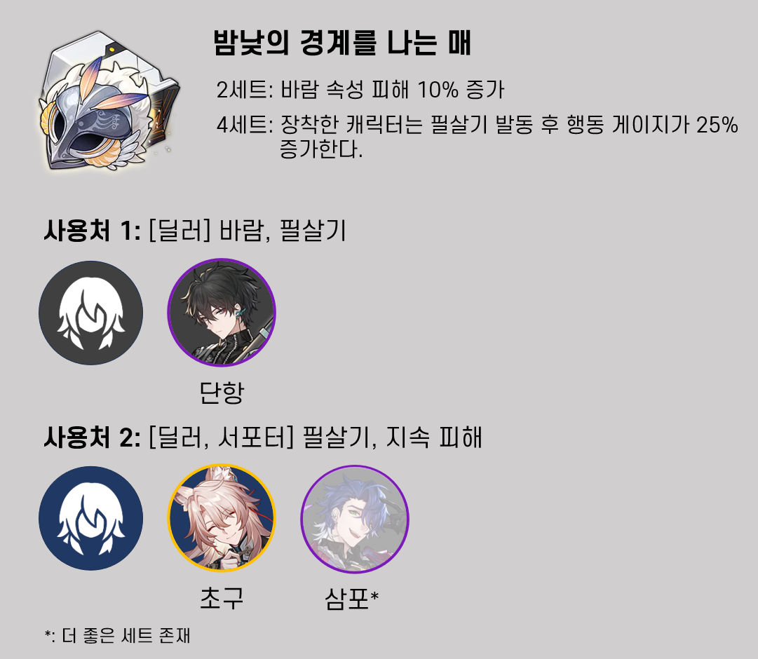 밤낮의 경계를 나는 매 세트는 스타레일의 초창기 세트입니다. 바람 딜러를 위주로 설계되어 있으나 필살기 발동 후 행동 게이즈 증가 옵션이 유용해 다른 속성 캐릭터도 사용 가능합니다. 현재 이 세트는 효용성이 낮은 편입니다.