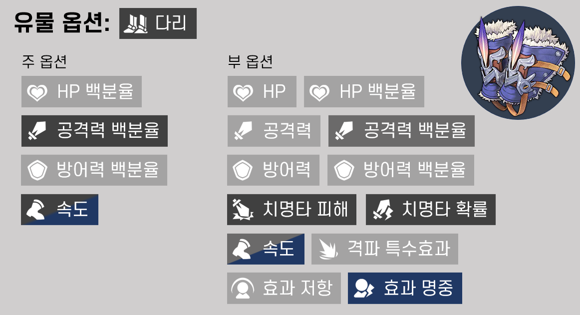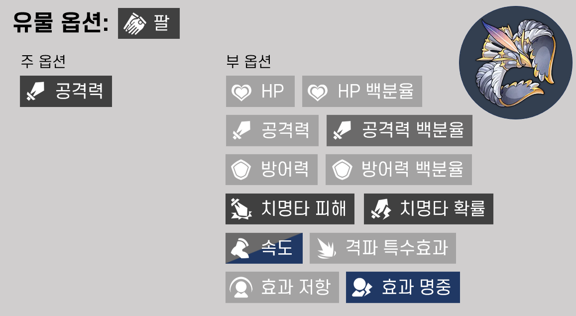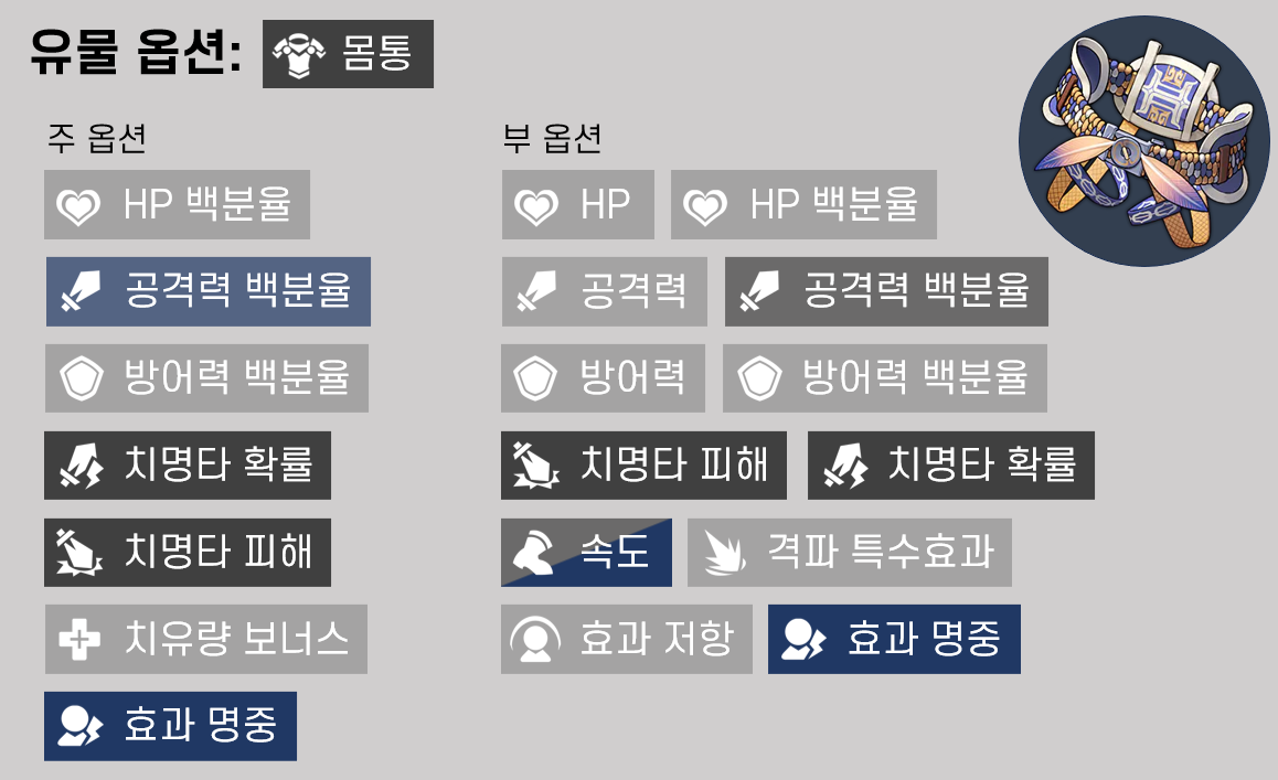 매 세트는 일반 딜러(단항), 지속 피해 딜러/서포터(초구, 삼포) 두 케이스로 나누어 옵션을 체크합니다. 아래 그림에서는 색으로 구분해 두었으니 참고해 주세요. 색이 진할수록 가치가 높습니다.