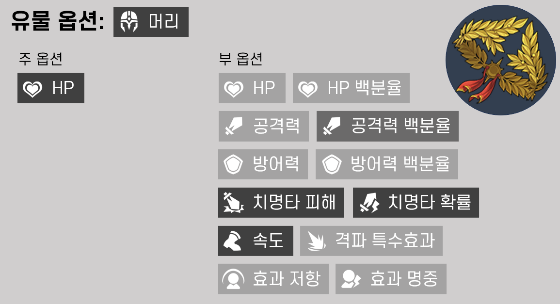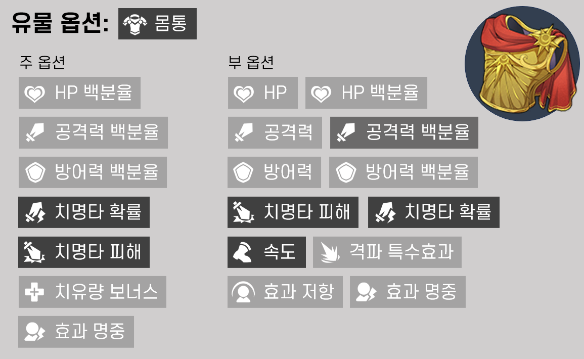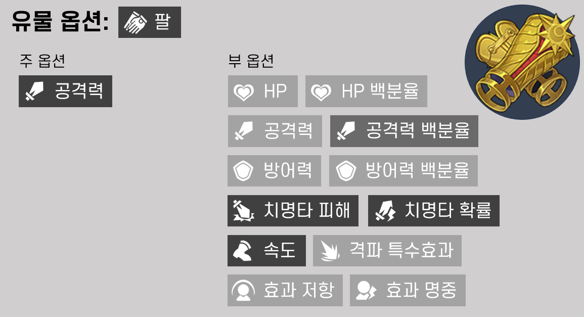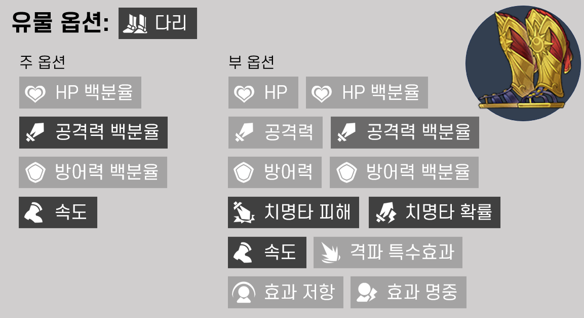 기억 개척자의 경우, 엠포리어스 스토리 진행 및 탐사를 통해 성혼 6돌파가 가능합니다. 이 경우 필살기가 확정 치명타로 적용됩니다. 그 외에, 기억 개척자의 특징인 확정 피해는 치명타가 들어가지 않습니다. 결국 기억 개척자의 경우 치명타 확률은 무효 옵션이 되는 셈입니다. 따라서 몸통은 치명타 피해, 다리는 속도를 채용합니다.