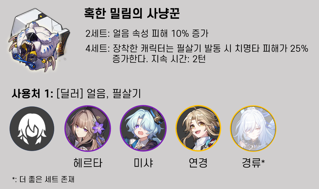 혹한 밀림의 사냥꾼 세트는 붕괴 스타레일 첫 서비스부터 존재했던 세트입니다. 얼음 속성 딜러 중 필살기를 주력으로 사용하는 캐릭터들을 위해 설계되어 있습니다. 대상 캐릭터로는 헤르타, 미샤, 연경, 경류가 있습니다.