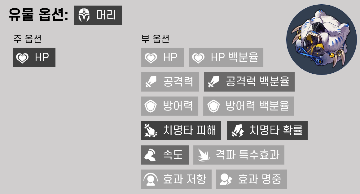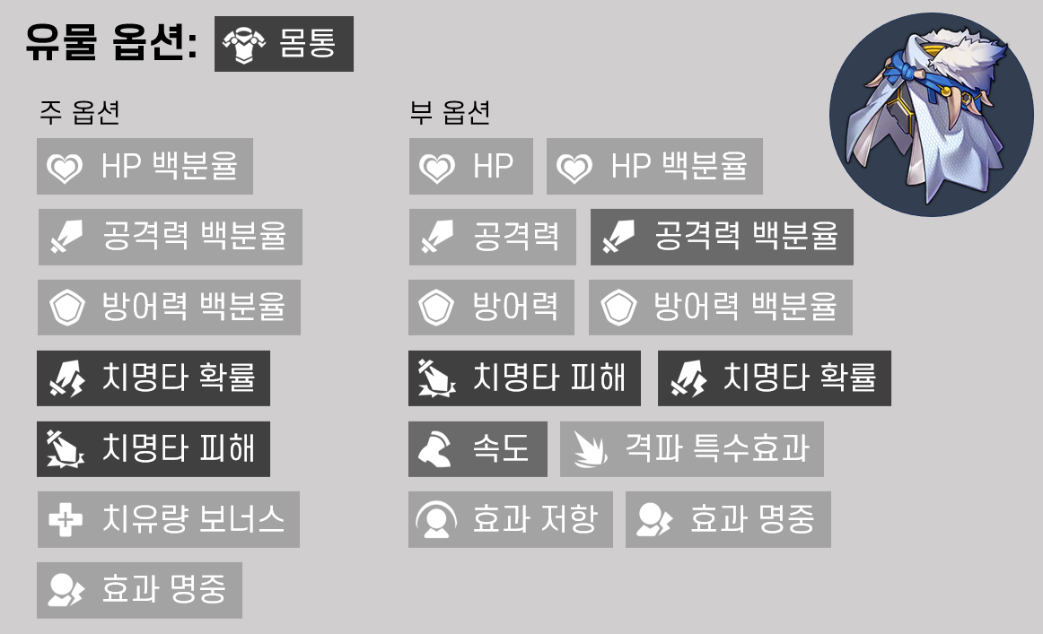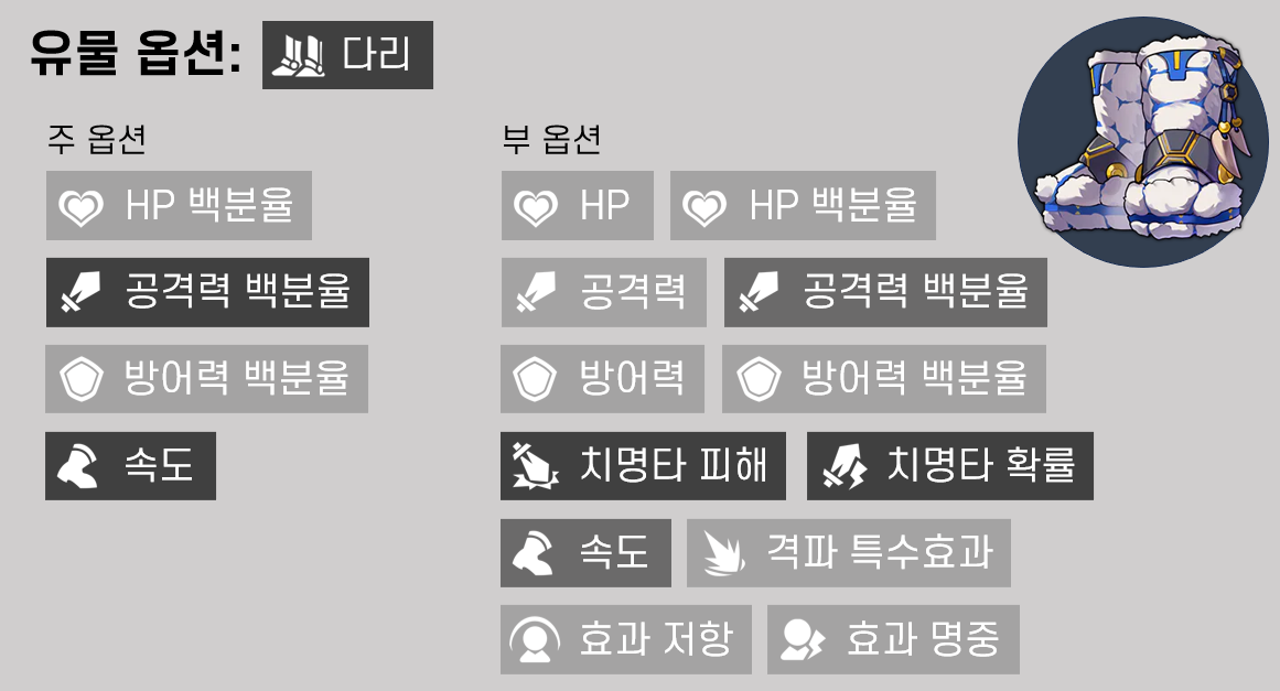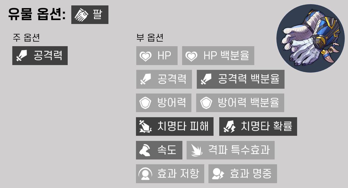 위 캐릭터들 모두 딜러 캐릭터로 주, 부옵션 풀이 동일하므로 유효 유물 판별이 용이한 편입니다. 아래 각 부위별 주, 부옵션 유효 여부를 정리해 두었습니다. 색이 진할수록 가치가 높습니다.