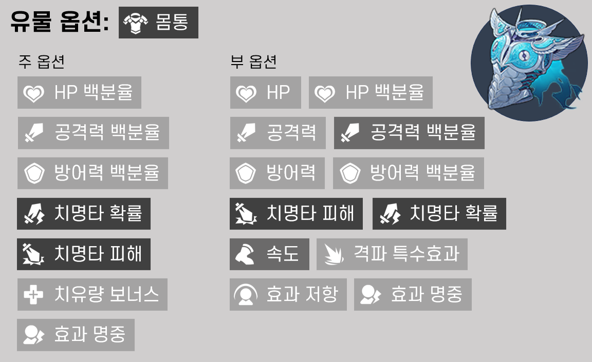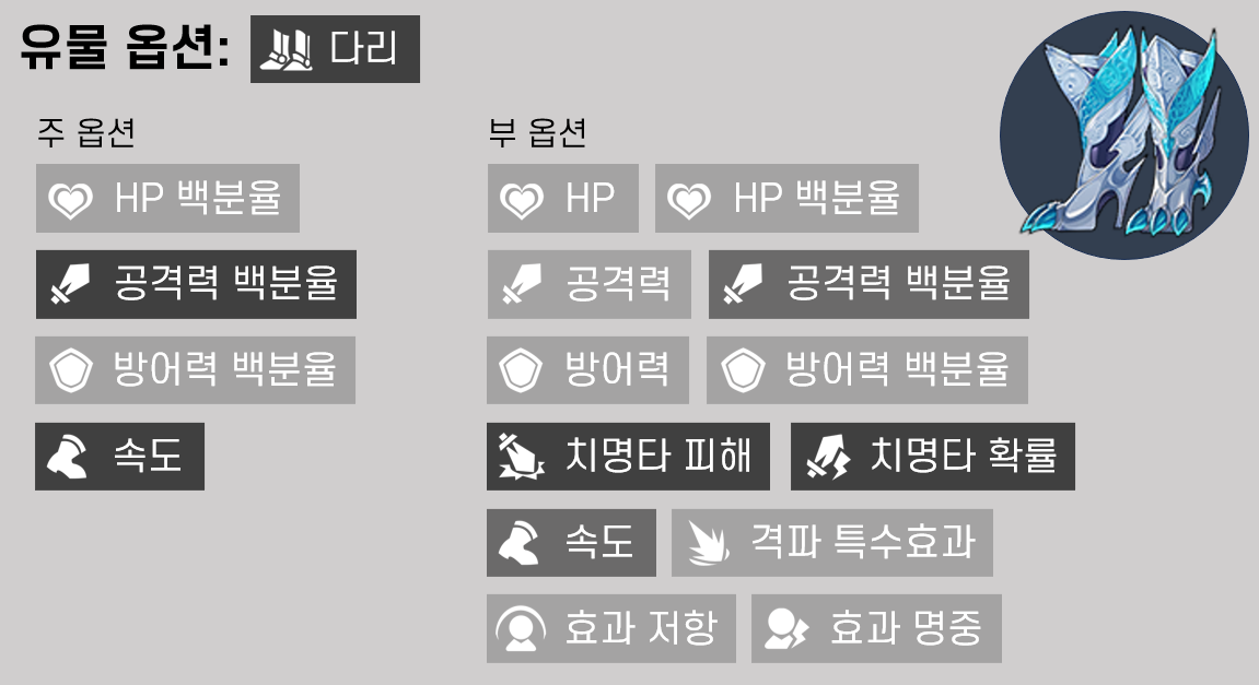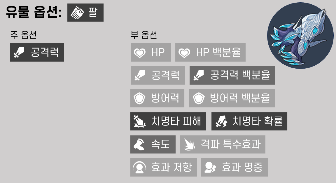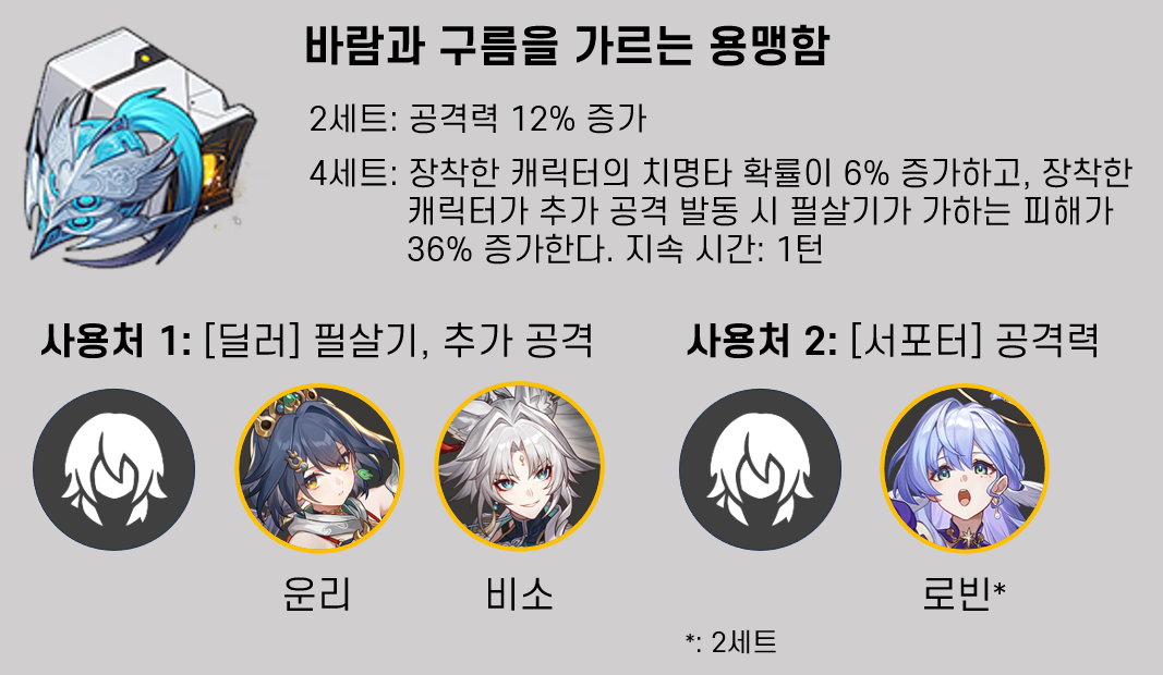 로빈 같은 경우 버프 수치가 공격력 수치를 따라 가기 때문에 2세트에 공격력 증가 12%가 붙어 있는 유물 2+2세트를 사용하며, 바람과 구름을 가르는 용맹함 세트 역시 이에 해당합니다.