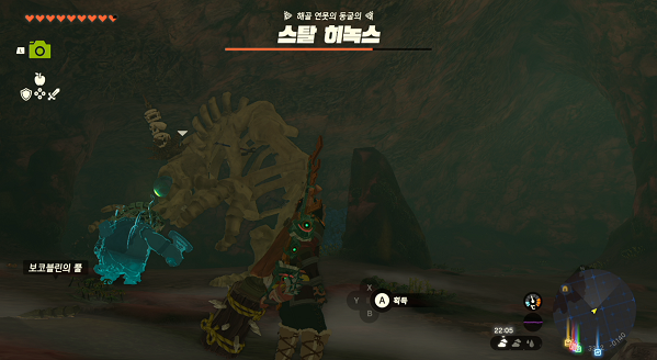 이 아래로 들어가시면 해골 연못의 동굴이라는 장소가 나옵니다. 안쪽에는 잡다한 몬스터들이 있고, 추가로 스탈 히녹스가 있습니다(아래 사진 참고). 스탈 히녹스는 화살로 눈을 맞추면 그로기 상태에 빠지지만 손으로 눈을 가리기도 하므로 타이밍을 잘 보셔서 약점을 노리시면 좋습니다. 그 외에도 발 쪽을 공격해도 정상적으로 체력이 빠지므로 스탈 히녹스의 공격을 잘 피하면서 발을 공략하면 어렵지 않게 잡을 수 있습니다.