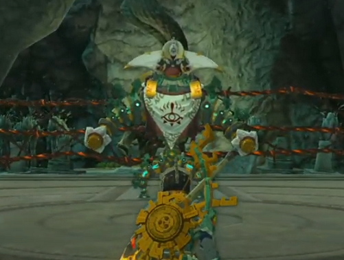 골렘의 패턴은 팔 휘두르기, 골렘 양 옆에서 화염방사, 이가단 폭탄 3연속 투척 등이 있는데요. ZL로 실드를 올린 뒤 근접해서 코가님 골렘의 공격을 막고 내 공격을 차분히 명중시키면 쉽게 클리어하실 수 있습니다. 이렇게 골렘을 마무리하시면 코가님은 최종 보스가 있는 곳의 힌트를 주고 퇴장하게 되는데요. 어떻게 퇴장하는지, 최종 보스가 있는 곳의 힌트는 무엇인지는 플레이하시는 분들의 재미를 위해 감춰두도록 하겠습니다.
